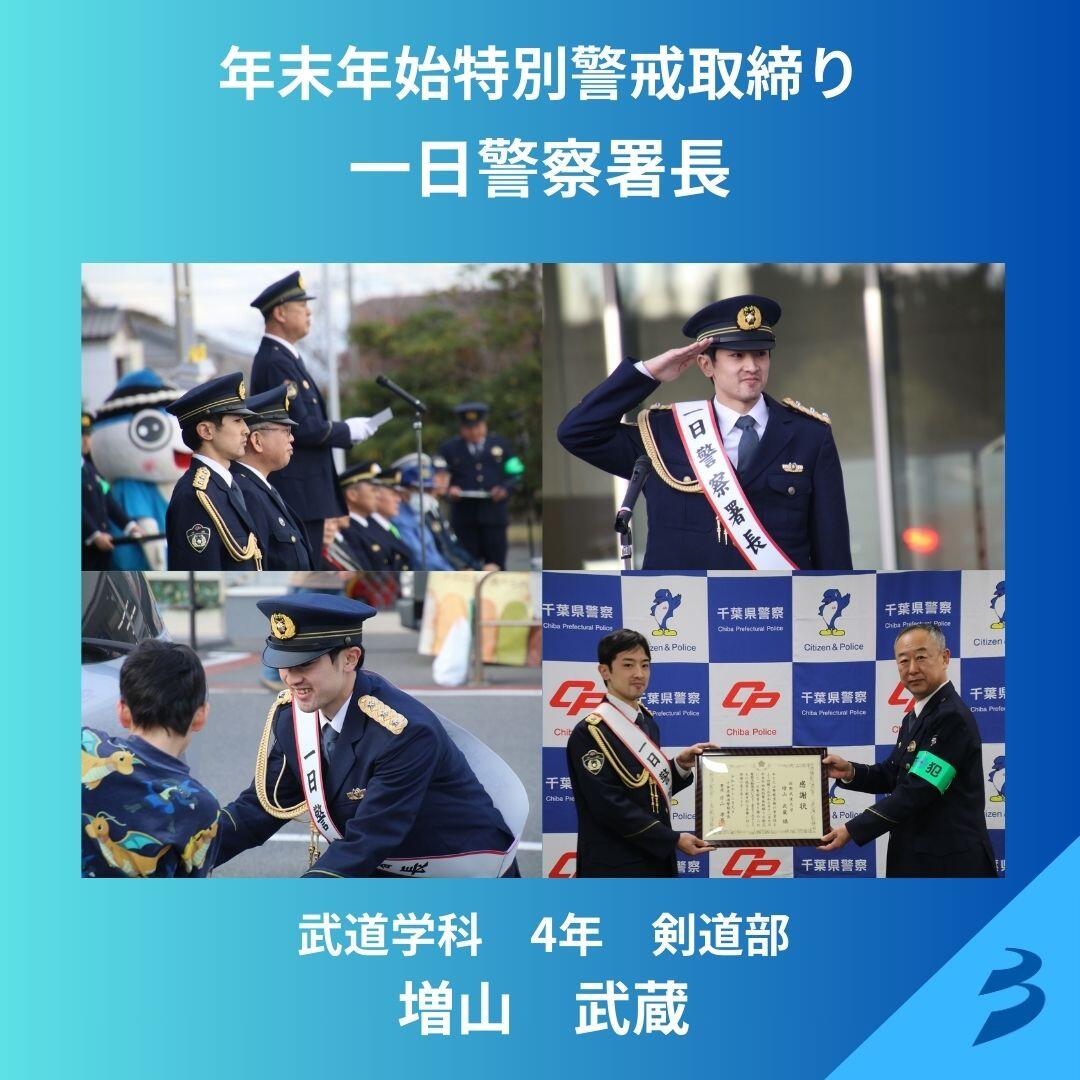 2025年12月9日(火)勝浦警察署における年末年始特別警戒取締りの「一日警察署長」に本学学生の増山武蔵さん(武道学科4年)が任命され、市内でキャンペーン活動を行いました。
