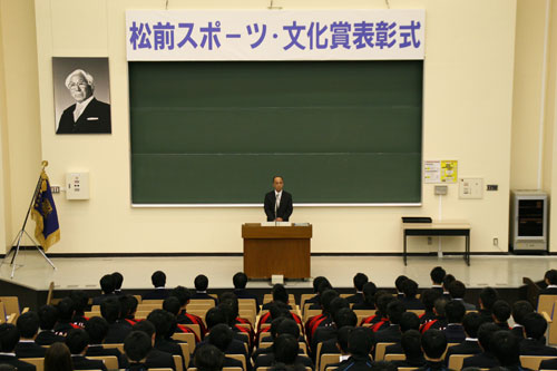 2016年2月8日(月)2015年度松前スポーツ・文化賞の表彰式を行いました。松前スポーツ・文化賞は、創設者松前重義博士の提唱により、スポーツ・文化活動の成果・実績が顕著であり、本学の発展に寄与した学生に対し贈られるものです。